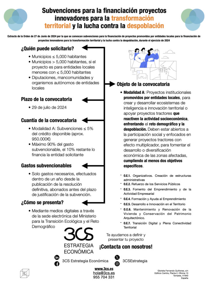 Extracto de la Orden de 27 de Junio de 2024 por la que se convocan subvenciones para la financiación de proyectos promovidos por entidades locales para la financiación de proyectos innovadores para la transformación territorial y la lucha contra la despoblación, durante el ejercicio de 2024